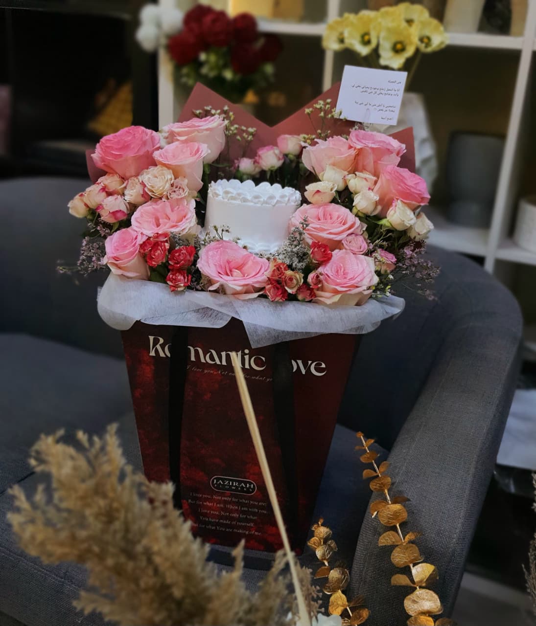 Luxury Pink Rose & Mini Cake Gift Bag | Fresh Flower Delivery Fujairah & Kalba