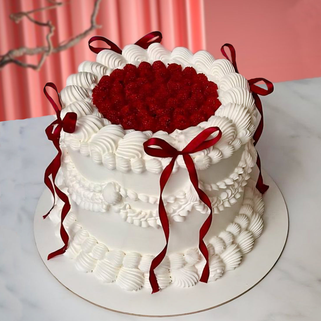 Luxury Heart Berry Cream Cake with Red Ribbons – Romantic Strawberry Cake UAE