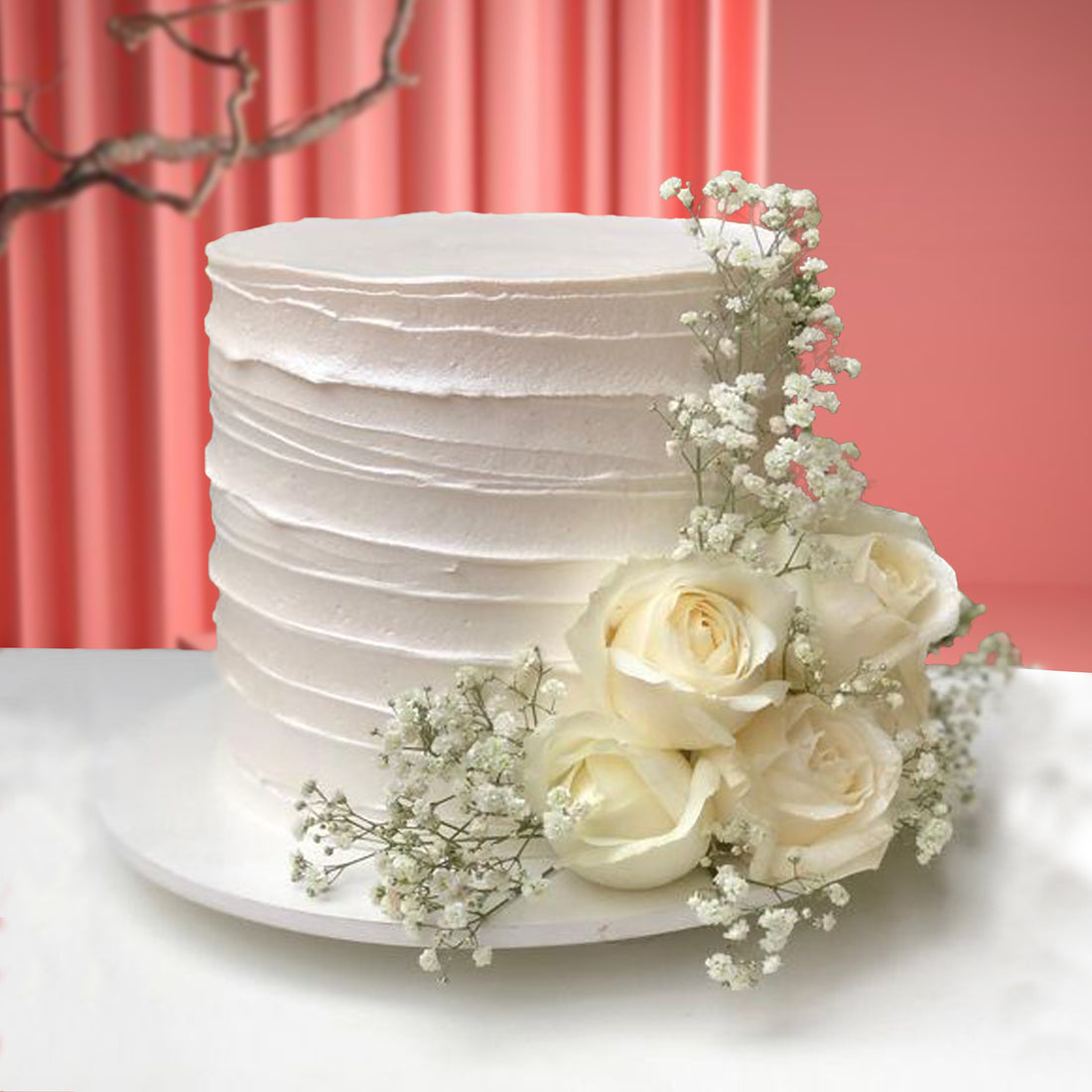 Elegant White Floral Cake with Fresh Roses – Luxury Celebration Cake UAE