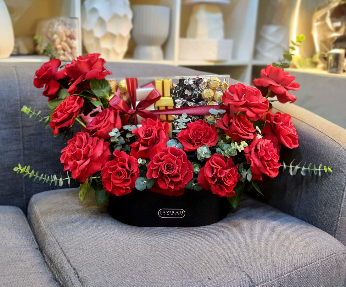 Red Roses & Chocolate Gift Box – Luxury Flower Arrangement UAE