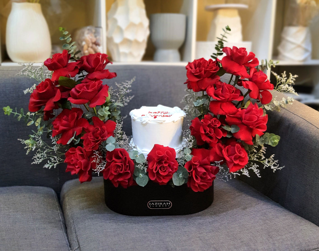 Red Roses Birthday Flower Box With Mini Cake – Fresh Flowers Gift Delivery UAE