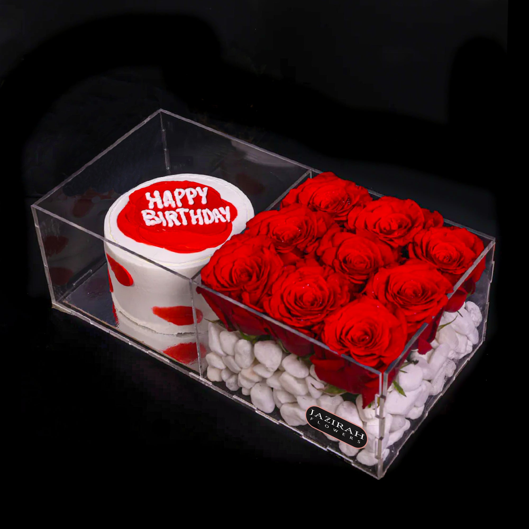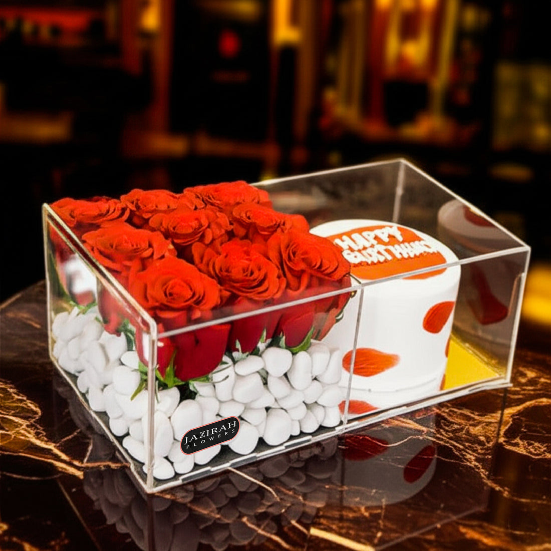 Red Roses & Mini Cake Gift in Acrylic Box – Jazirah Flowers UAE
