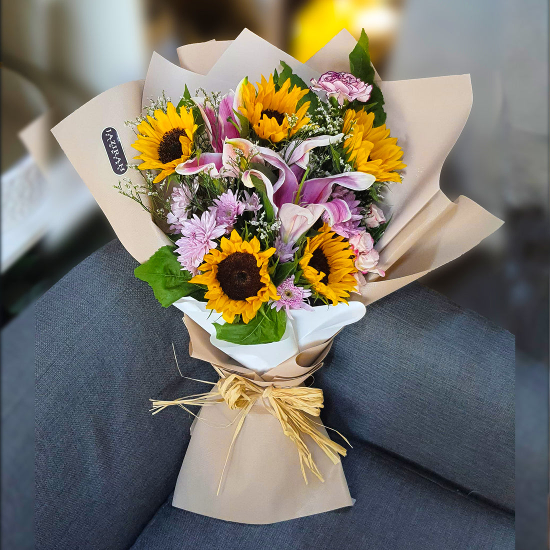 Sunflower & Lily Bouquet with Chrysanthemums & Spray Roses – Bright Wrapping Flower Arrangement Brighten any...