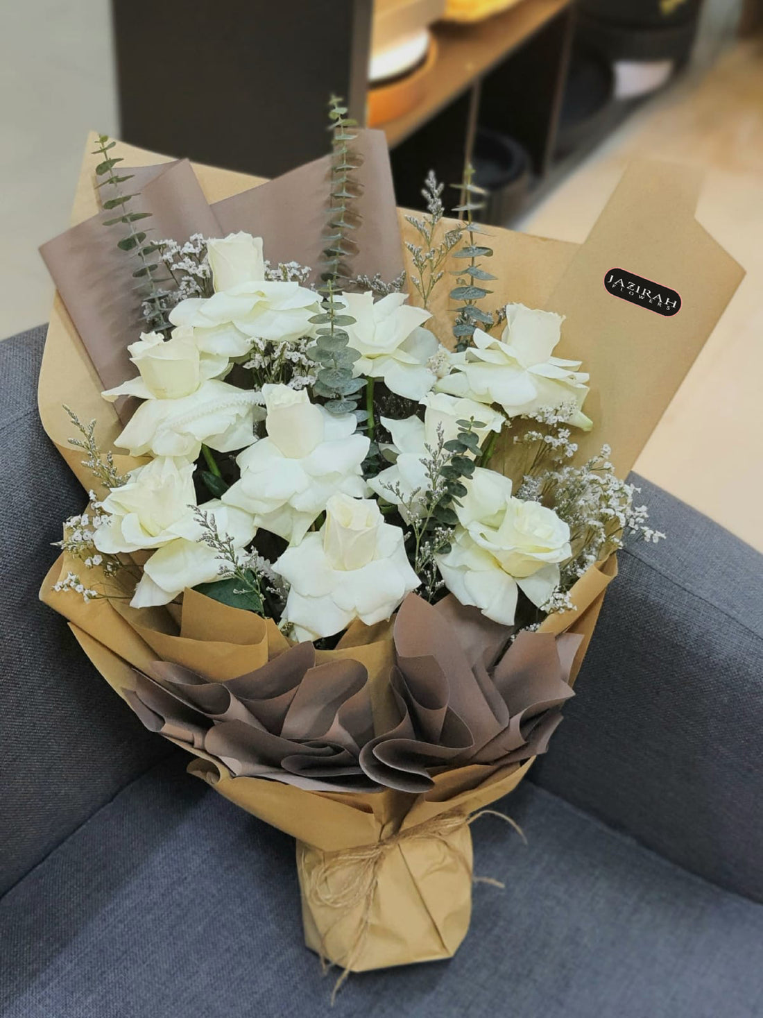 Elegant White Rose Bouquet – Fresh White Roses with Eucalyptus & Rustic Wrapping