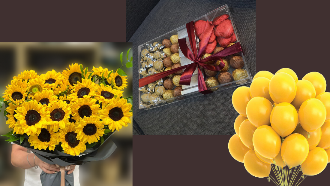 20 Sunflowers amazing wrapping bouquet with a tasty chocolate box & Yellow 12balloons