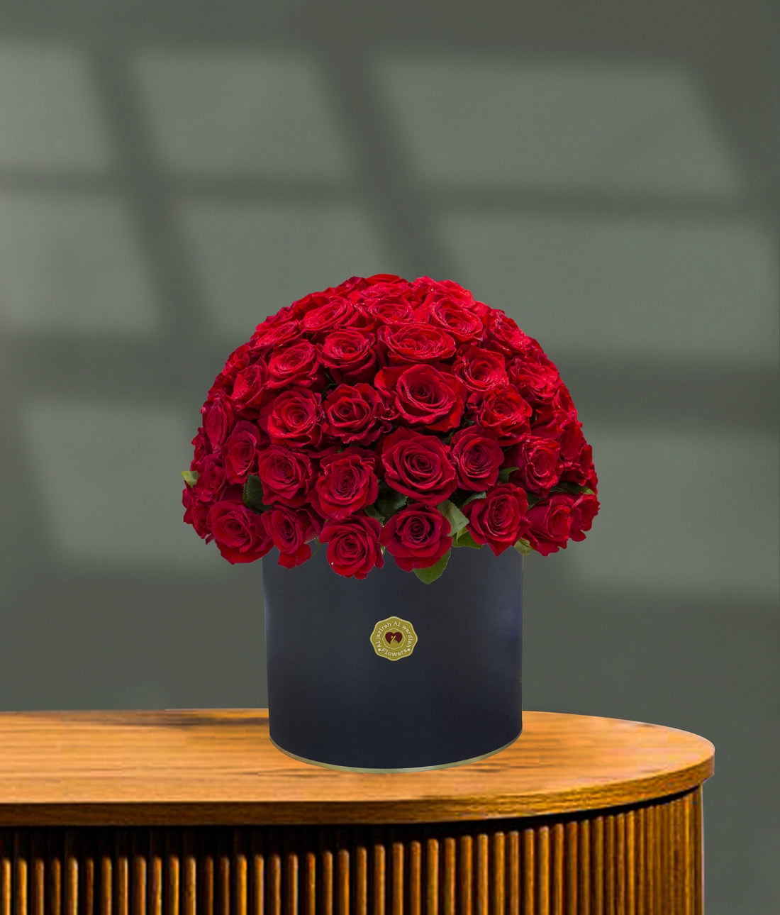 Celebrate love and elegance with our exquisite round box bouquet of red roses, beautifully presented...