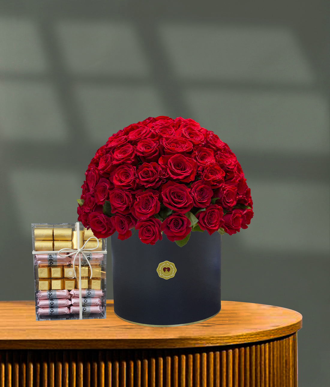A luxurious box of elegant red roses paired with premium chocolates, the perfect gift for...