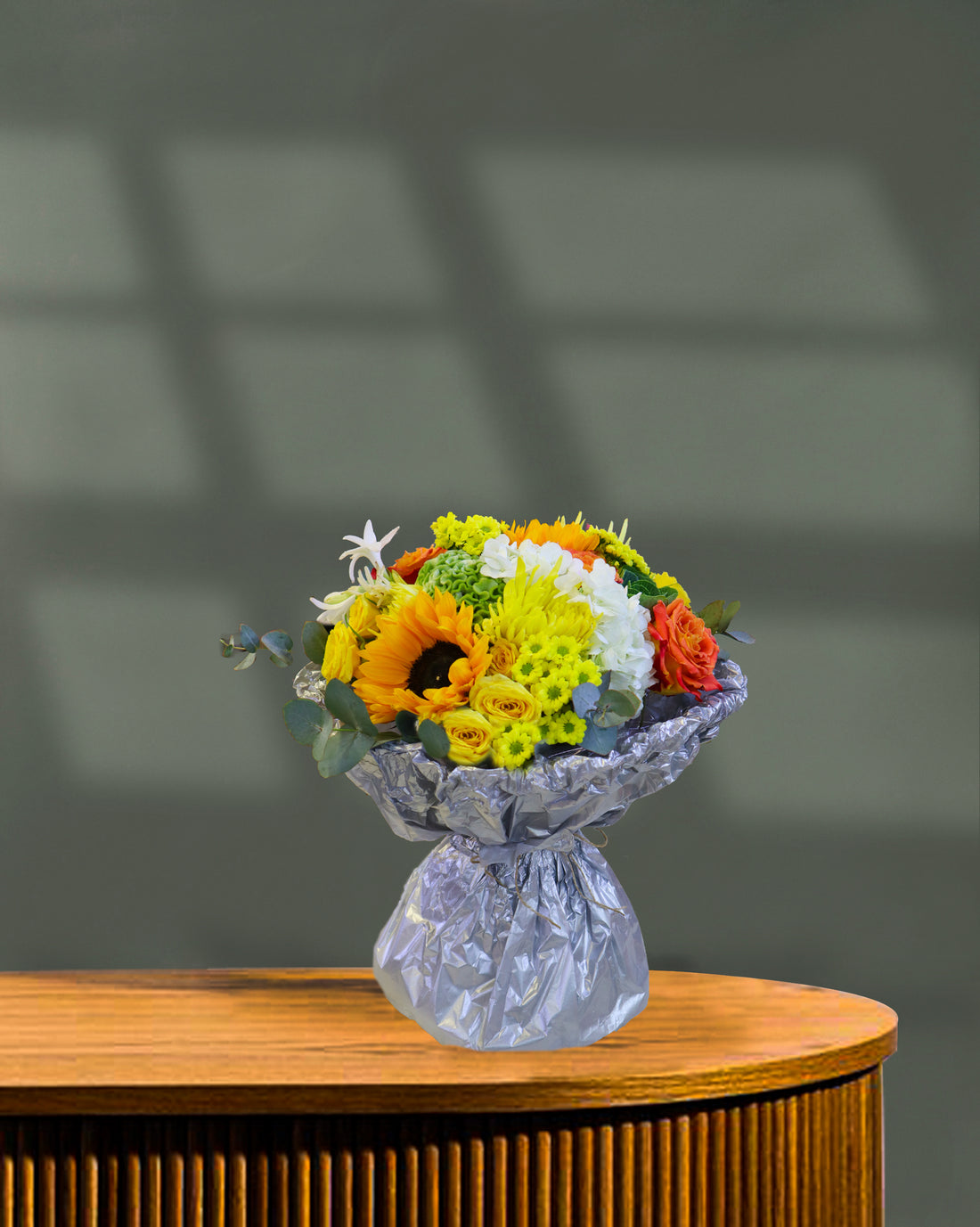 A vibrant wrapping bouquet featuring sunflowers, hydrangeas, chrysanthemums, and roses, beautifully arranged to bring a...