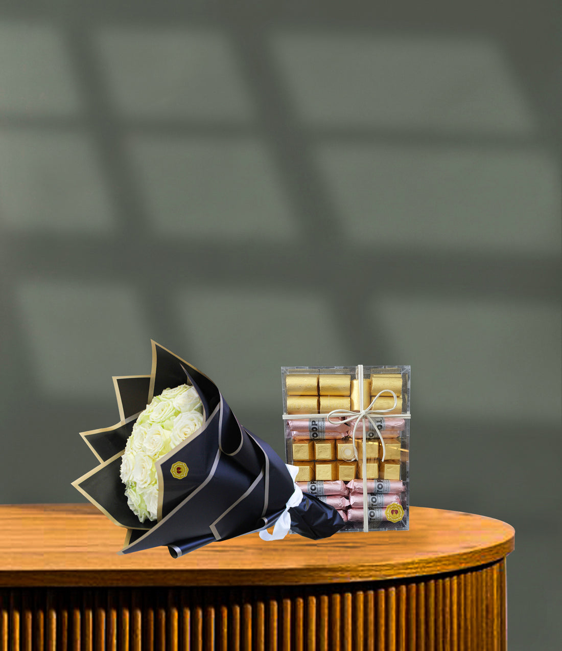 Express elegance and sweetness with our luxurious combination of a hand-tied bouquet of fresh white...