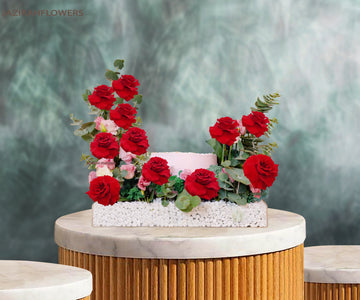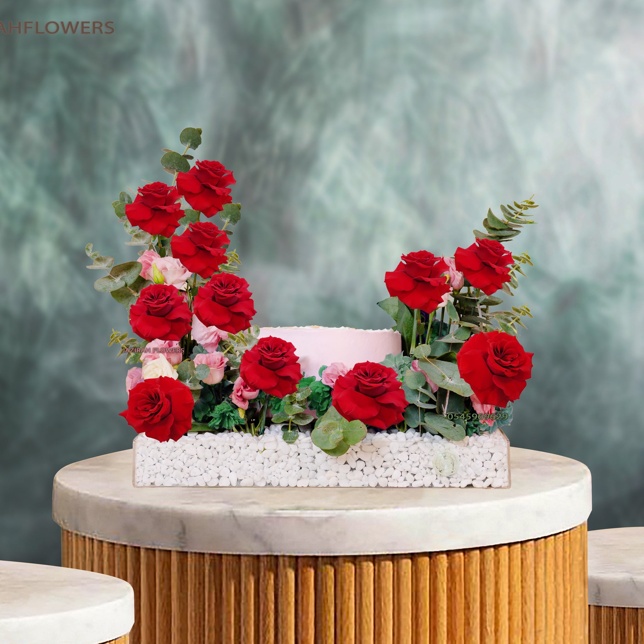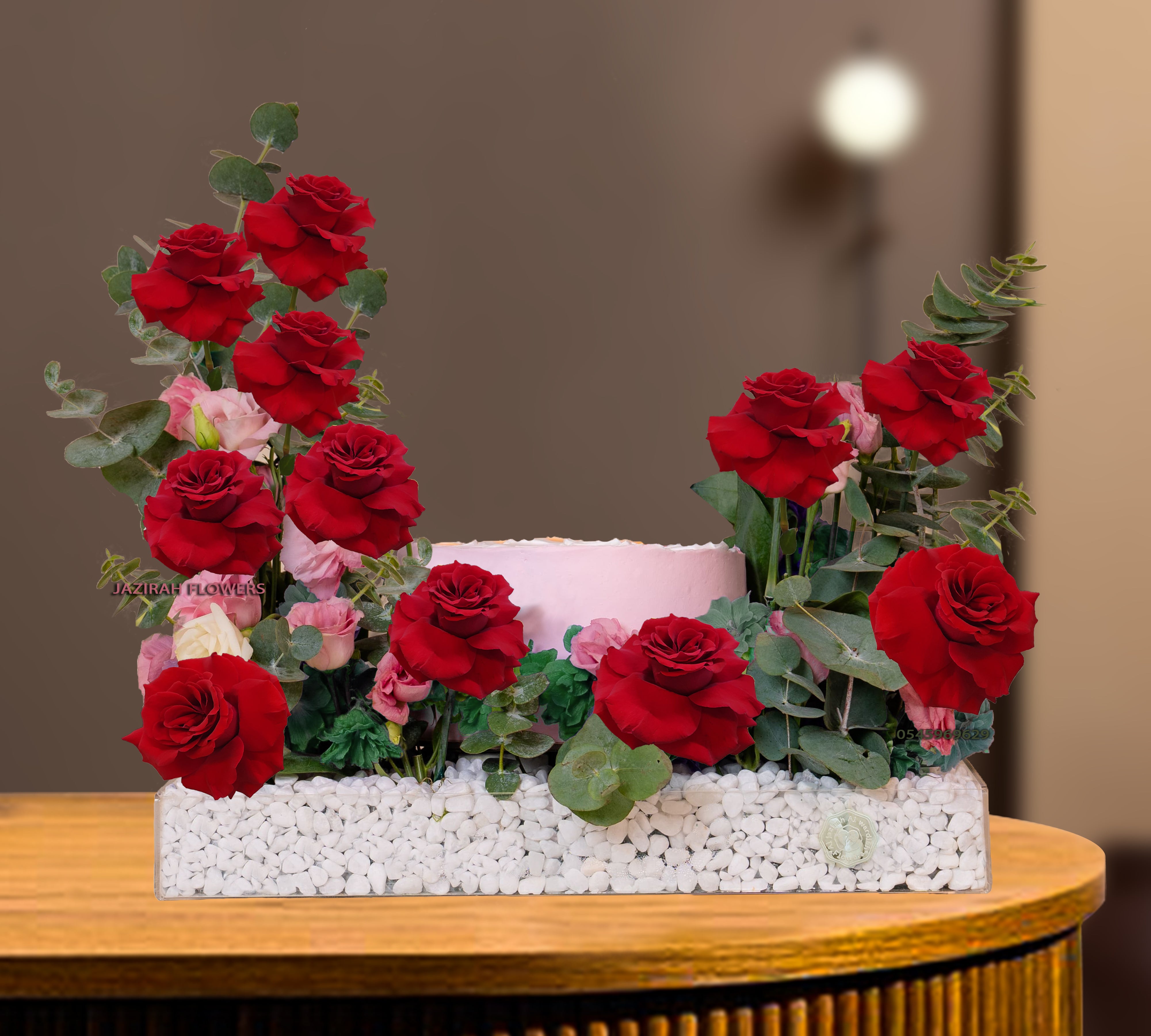 A luxurious gift bundle featuring a stunning Fresh Flower arrangement paired with a delicious cake, elegantly presented in a sleek acrylic tray. Perfect for birthdays, anniversaries, and special celebrations, this thoughtful combination adds beauty and sweetness to any occasion.