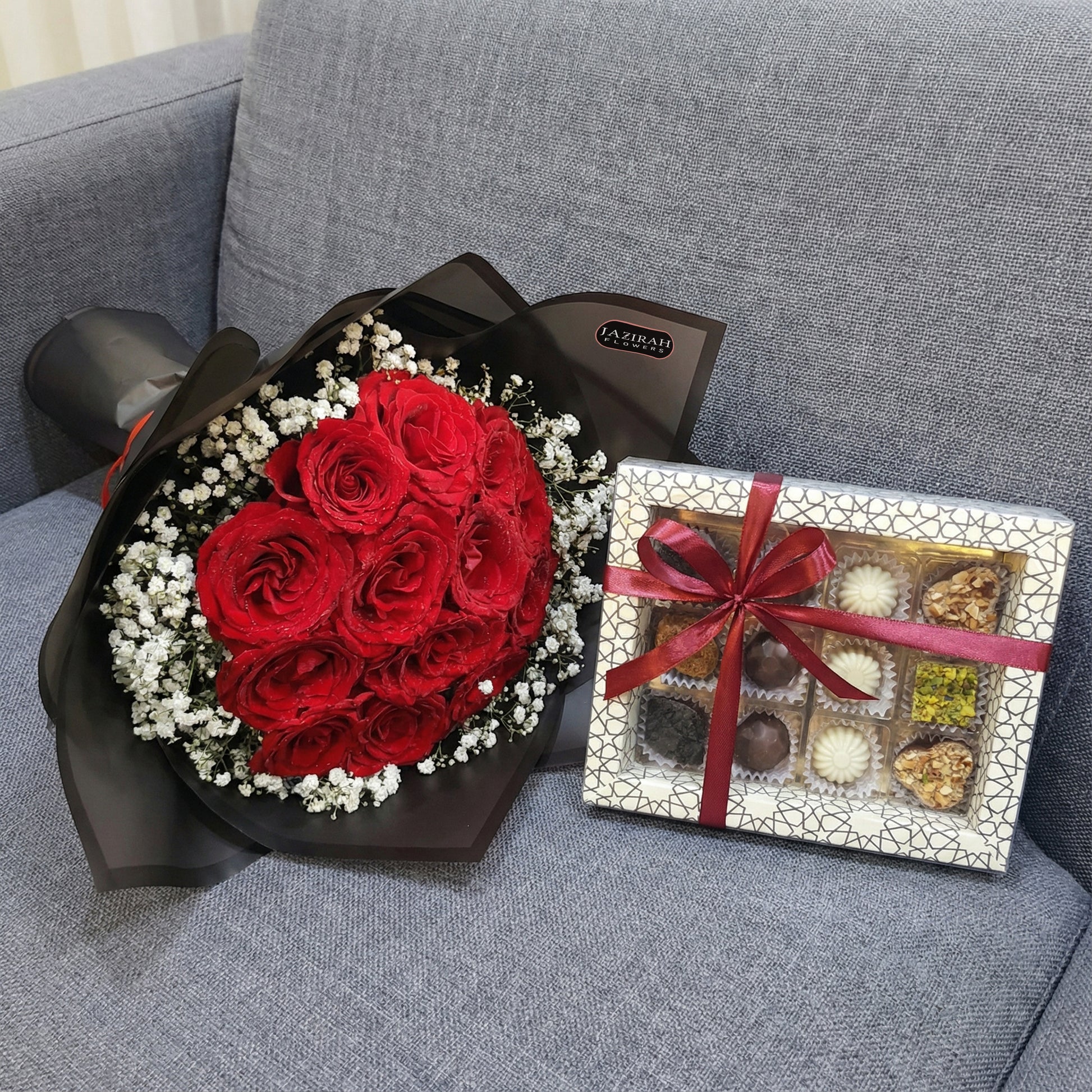 Make your gift unforgettable with this elegant red rose bouquet paired with a premium assorted chocolate box. The bouquet features fresh red roses beautifully arranged with delicate white filler flowers and wrapped in stylish black paper for a luxurious look.